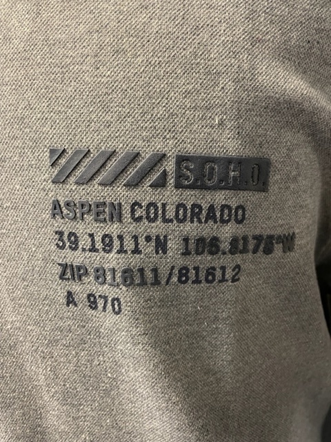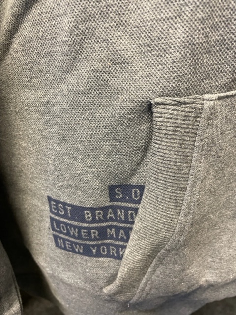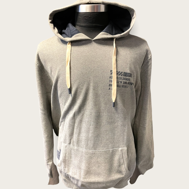 Ein grauer Hoodie mit Kapuze der Marke SOHO, der Hoodie hat einen kleinen Aufdruck auf der Brust und an den Hoodietaschen.