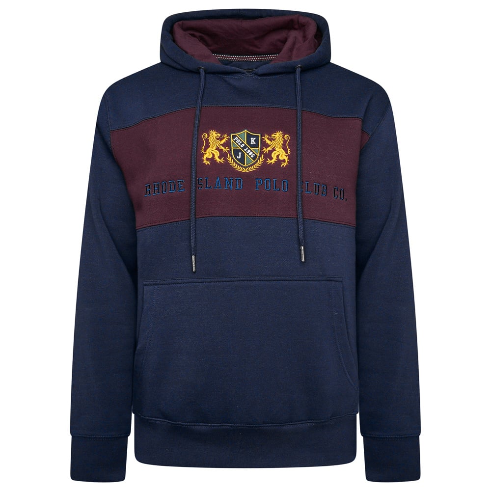 Ein schöner warmer Kapuzenpullover der Marke KamJeansWear in der Farbe Marineblau/Burgund. Der Kapuzenpullover hat eine Kapuze und eine Seitentasche.