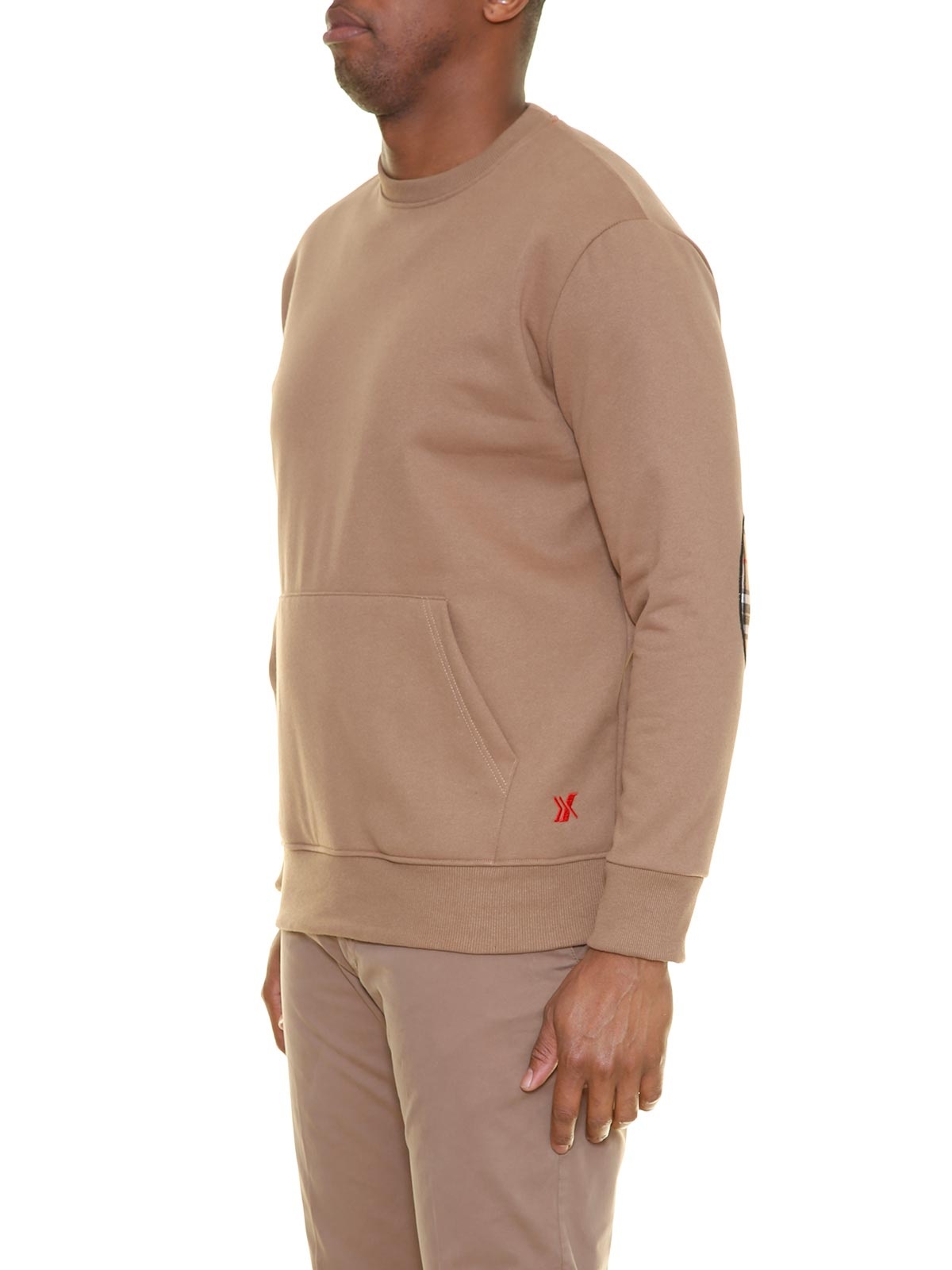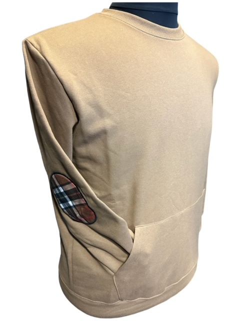 Ein warmer Kapuzenpullover der Marke Maxfort in Braun, der Hoody hat Seitentaschen und Patches an den Ärmeln.