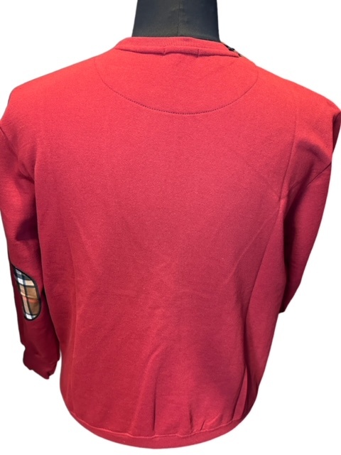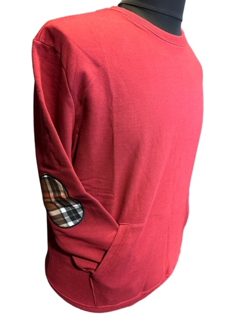 Ein warmer Kapuzenpullover der Marke Maxfort in der Farbe Burgunderrot. Der Kapuzenpullover hat Seitentaschen und ist mit Patches an den Ärmeln versehen.