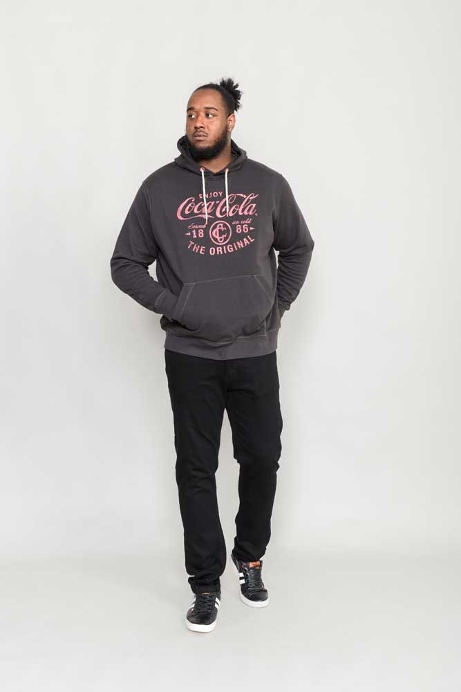Ein Kapuzenpullover in der Farbe Wash Black von der Marke D555 mit Coca-Cola-Aufdruck. Der Kapuzenpullover hat Taschen.