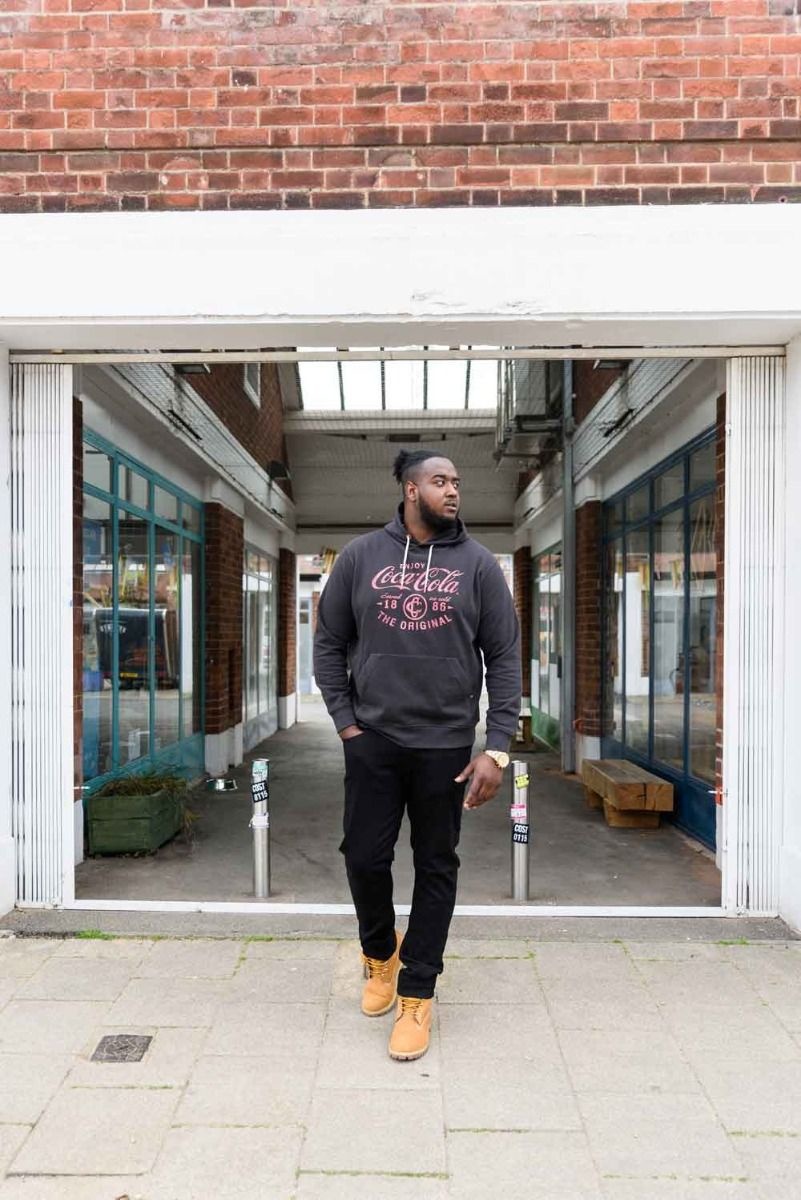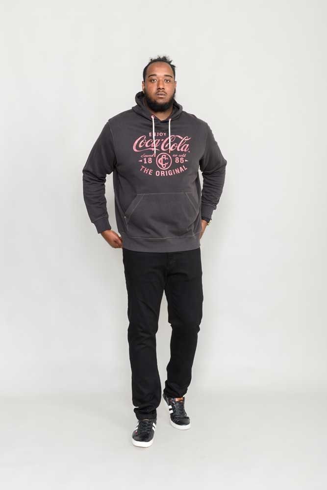 Ein Kapuzenpullover in der Farbe Wash Black von der Marke D555 mit Coca-Cola-Aufdruck. Der Kapuzenpullover hat Taschen.