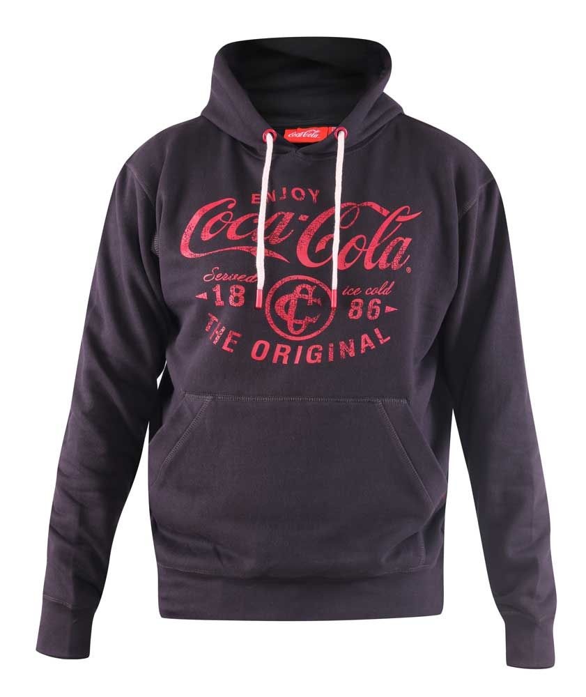 Ein Kapuzenpullover in der Farbe Wash Black von der Marke D555 mit Coca-Cola-Aufdruck. Der Kapuzenpullover hat Taschen.