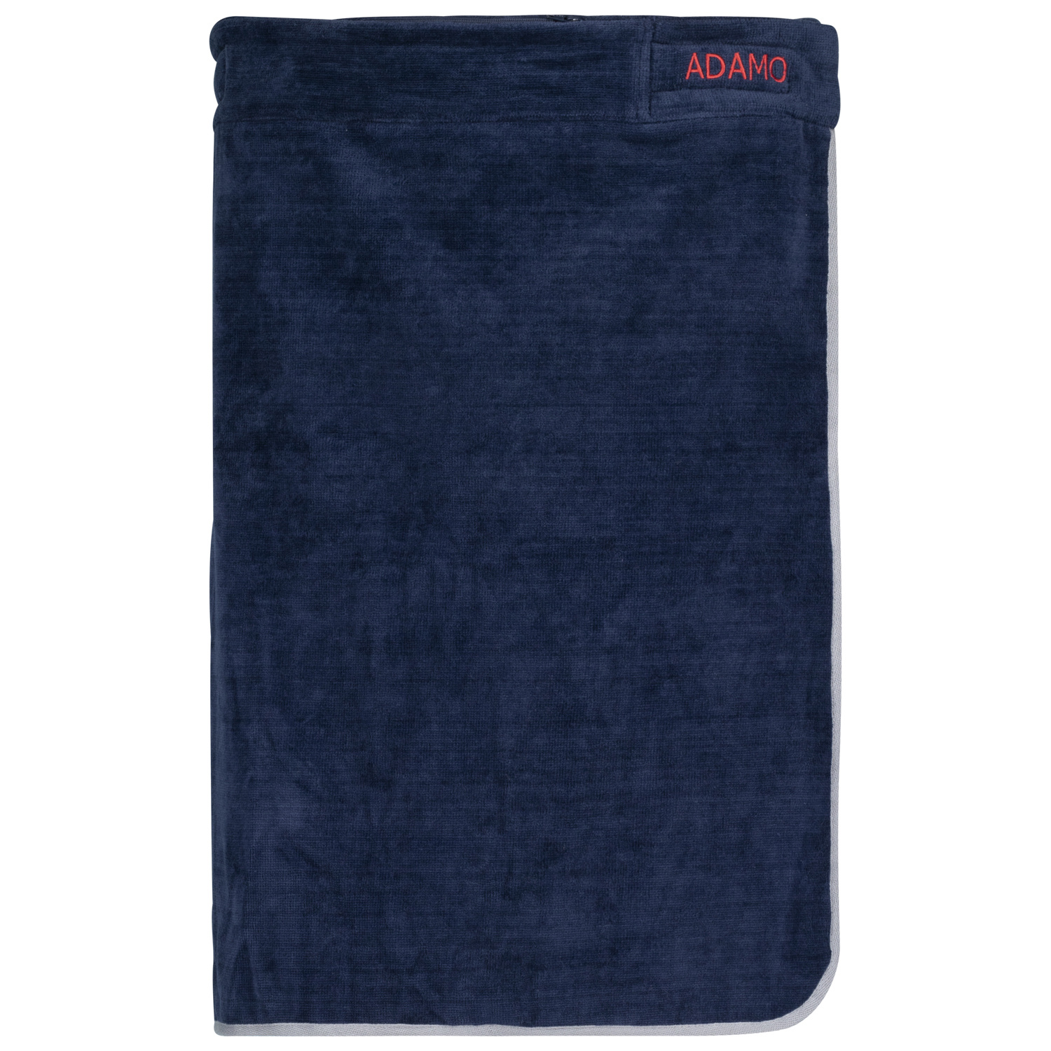 Ein Saunakilt in Marineblau, ein einfaches Handtuchsystem, das um die Taille getragen und mit Klettverschluss befestigt werden kann.