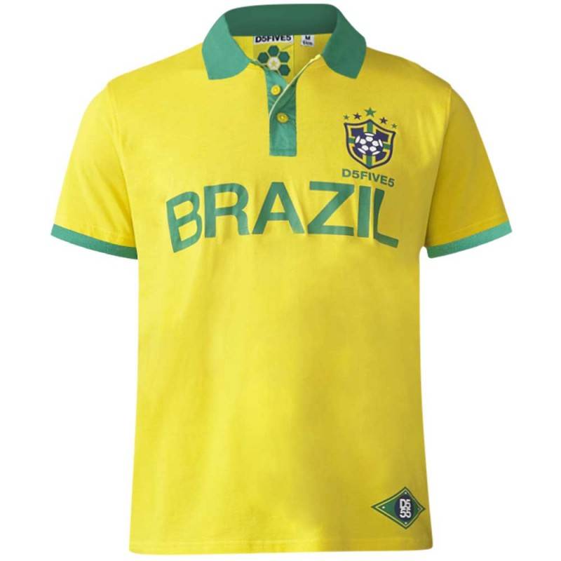 Ein Sommer-Fußball-Poloshirt Brasilien in der Farbe Gelb mit grünem Besatz an Kragen, Ärmeln und Schriftzügen. Das Poloshirt hat einen Brasilien-Aufdruck auf der Vorderseite und die Nummer 11 auf der Rückseite.