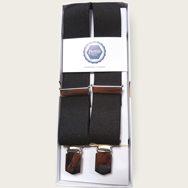Ein einfaches Paar Hosenträger in Schwarz von der Marke Portia. Die Hosenträger haben robuste Krokodilklemmen, sodass sie sich nicht so leicht lösen.