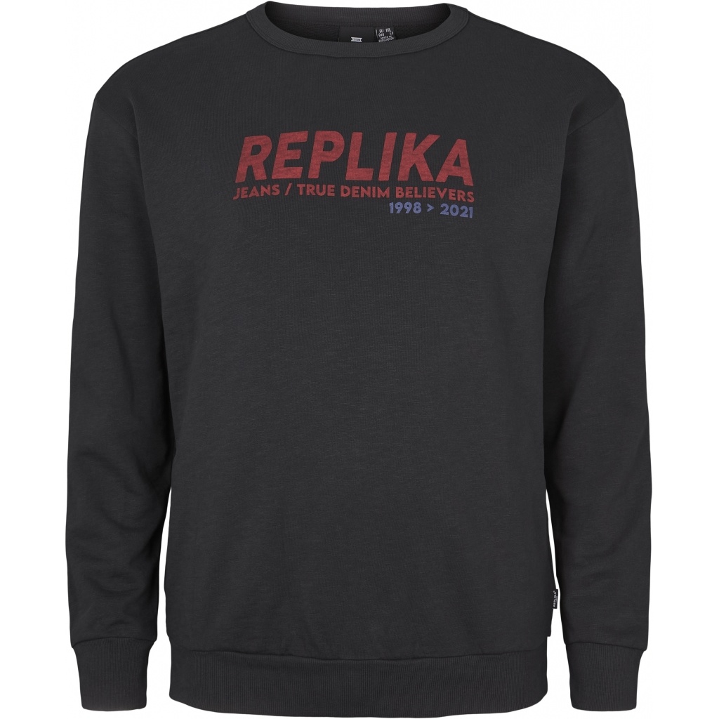 Ein Rundhalspullover der Marke Replika in Schwarz, der Pullover hat einen Logo-Aufdruck auf der Vorderseite.