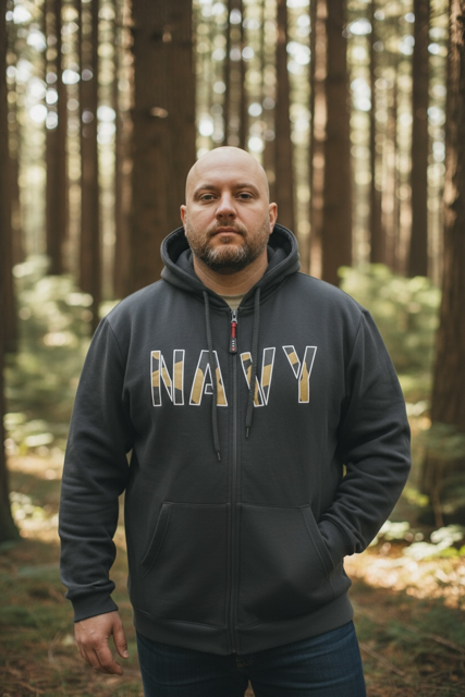 KAPUZENPULLOVER MIT DURCHGEHENDEM REISSVERSCHLUSS, VERSTELLBARE KAPUZE MIT KORDELZUG, LANGE ÄRMEL, 2 AUFGESETZTE SEITENTASCHEN, GERIPPTE BÜNDCHEN UND UNTEN, „MARINEBLAUER“ CAMOUFLAGE-EFFEKT-DRUCK AUF DER BRUST.