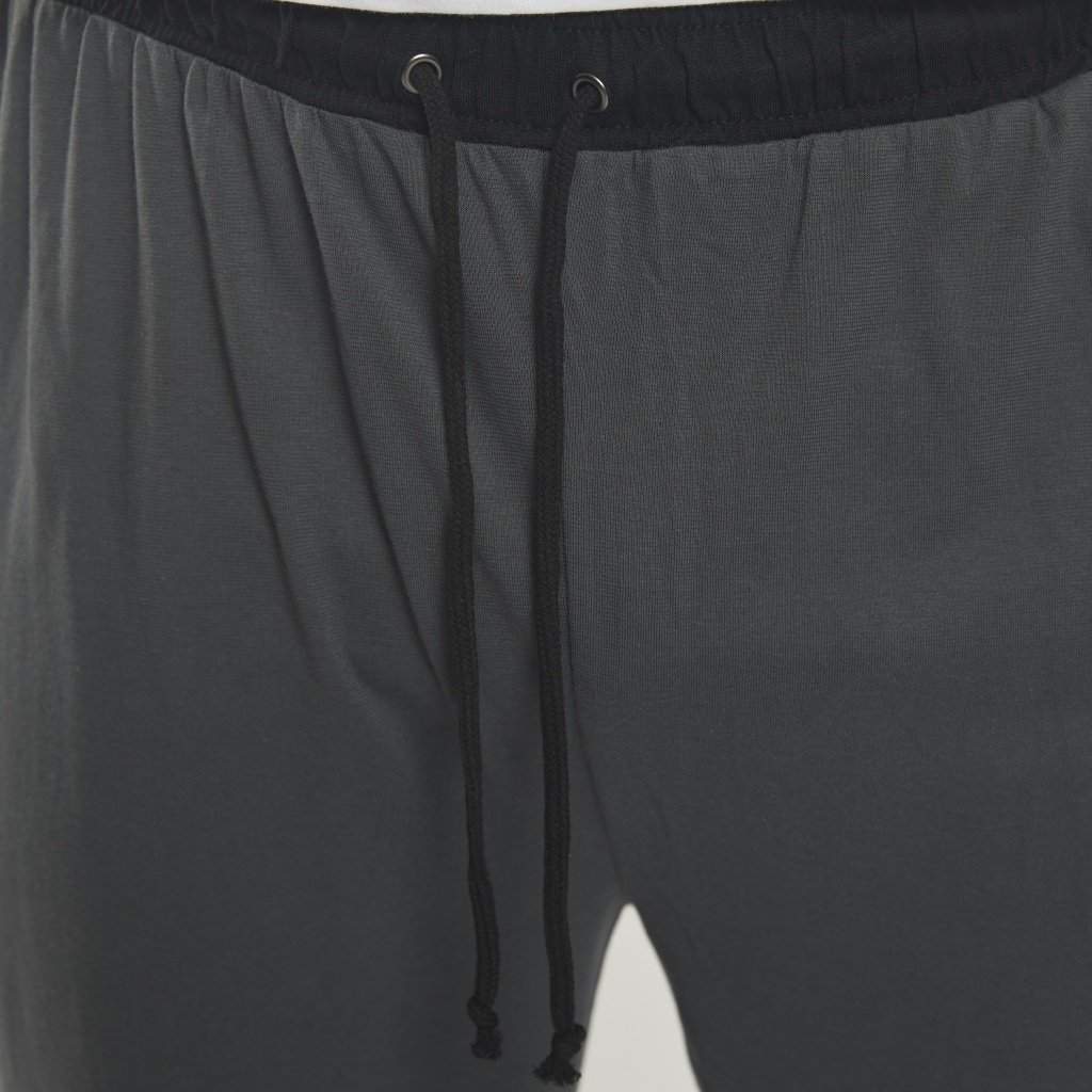 Dunkelgraue Pyjamahose mit schwarzem Bund und Kordelzug. Diese Hose kann mit dem Kurzarm-Jersey mit V-Ausschnitt oder dem Langarm-Jersey kombiniert werden.