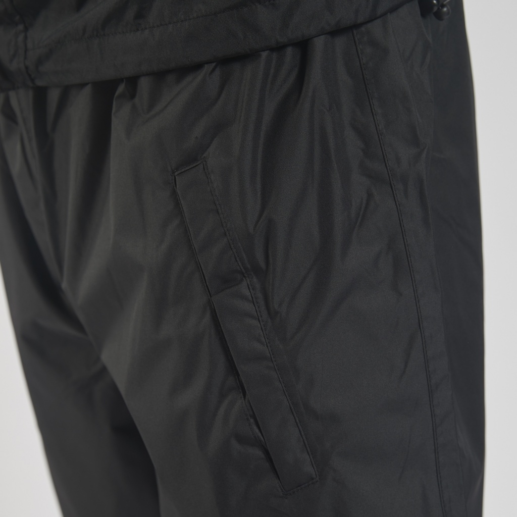Eine Regenhose der Marke North Latitude in der Farbe Schwarz. Die Hose ist mit Taschen mit Reißverschluss, verstellbarer Taille mittels Kordelzug und Klettverschluss an den Knöcheln ausgestattet, um sie wasserdicht zu machen.