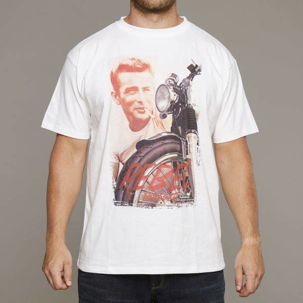Ein Bob Dylan T-Shirt in limitierter Auflage in Weiß mit dem Aufdruck „REBEL“