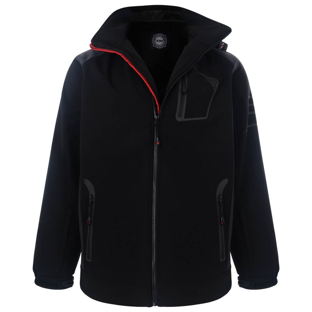 Eine sportliche Softshelljacke in Schwarz von KAM Jeanswear. Die Jacke ist wind- und wasserdicht und verfügt über mehrere zusätzliche Reißverschlusstaschen vorne und am Arm. Die Ärmel lassen sich mit einem Klettverschluss verstellen.