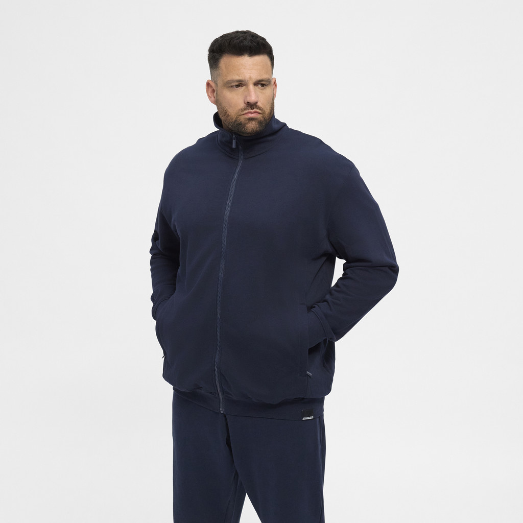 Eine einfache Sweatjacke in Marineblau, Jacke hat 2 Taschen.