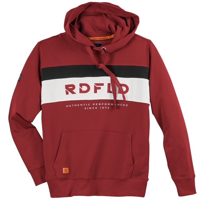 Ein moderner Hoodie der Marke Redfield in der Farbe Feuerrot, der Hoodie hat einen Aufdruck und Seitentaschen.