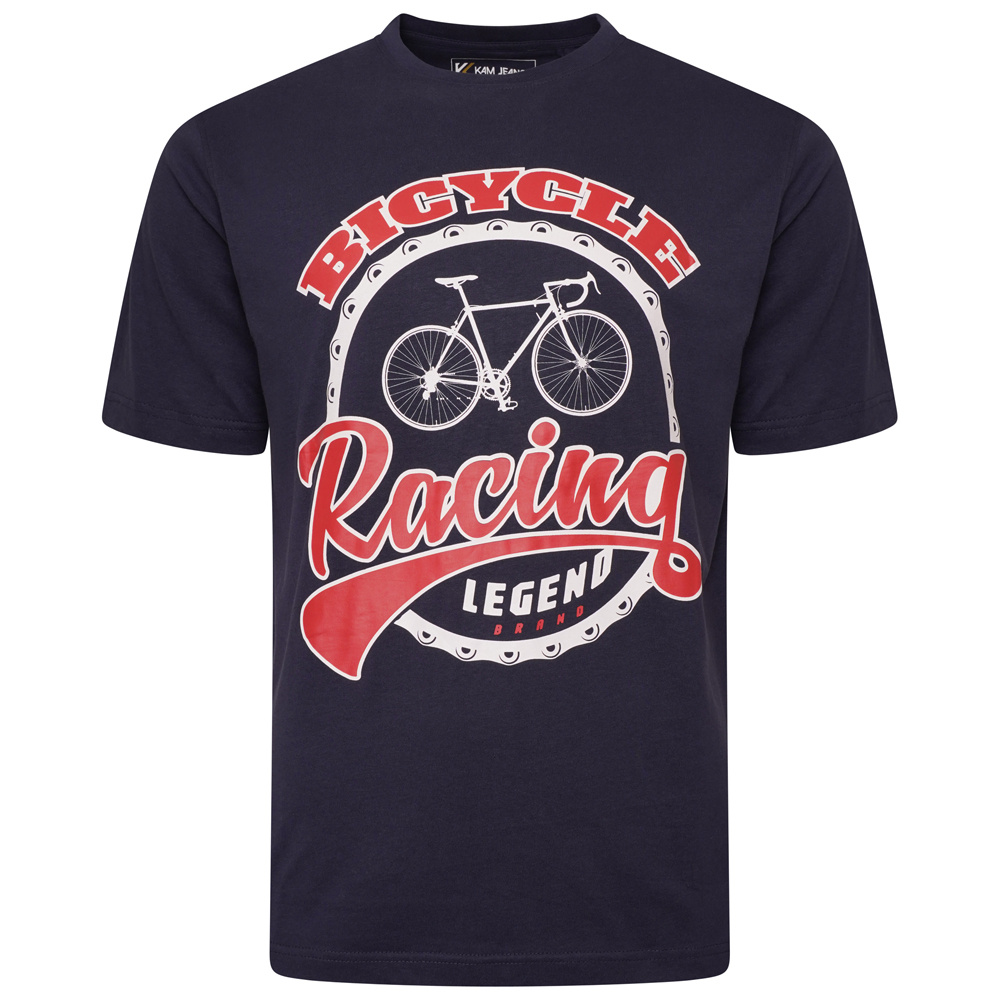 Ein blaues T-Shirt mit dem Aufdruck „Bicycle Racing Legend“ der Marke KAM.