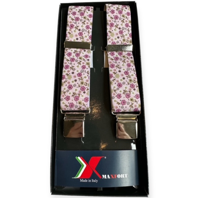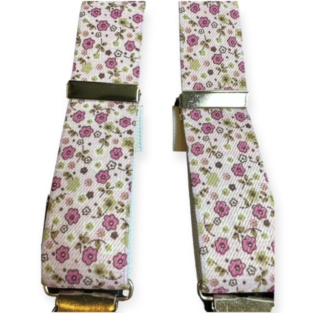Hosenträger in der Farbe Rosa mit Blumenmuster. Die Hosenträger sind mit breiten, stabilen Clips ausgestattet, damit Ihre Kleidung am richtigen Platz bleibt.