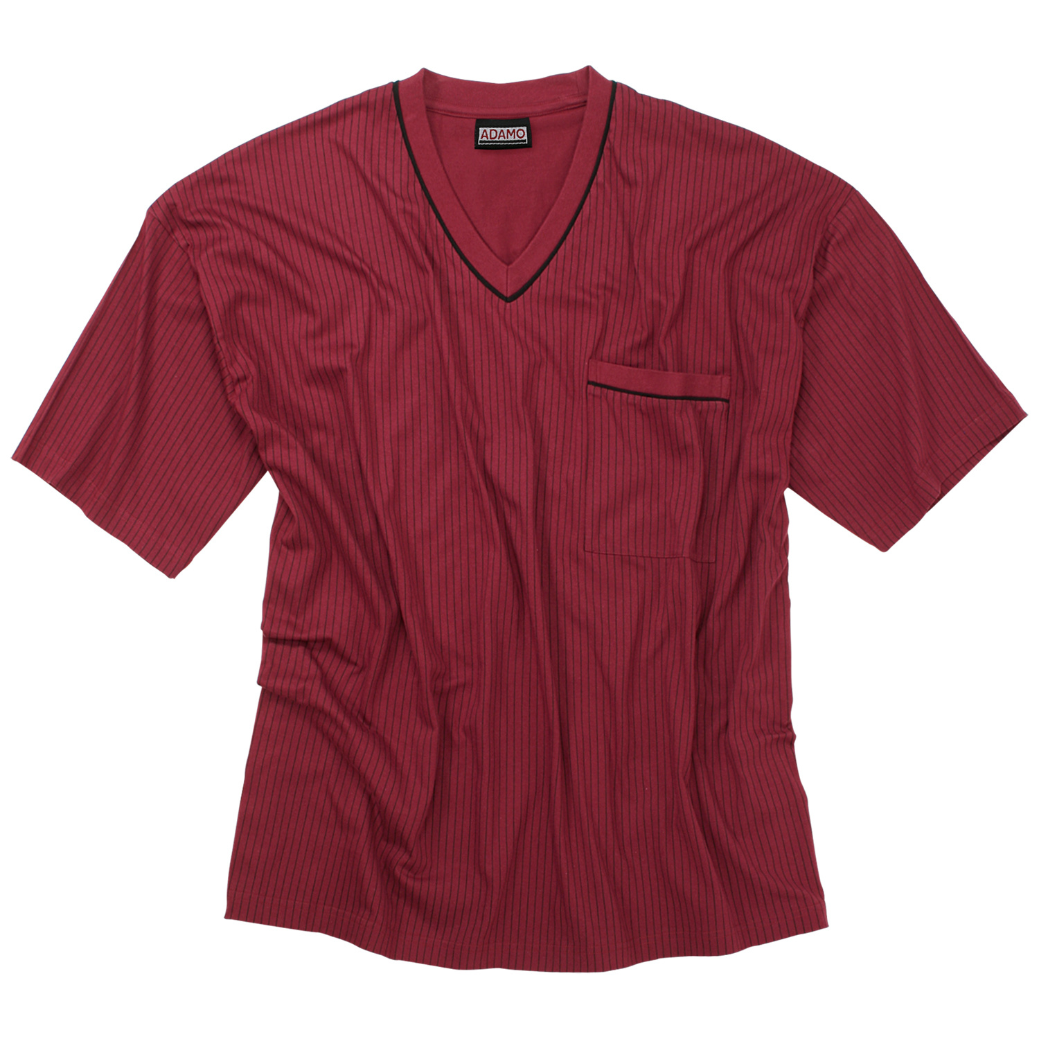 A pyjama from the brand Adamo in short version. Plain black shorts with a V-neck shirt in the color bordeaux, shirt has a breast pocket.