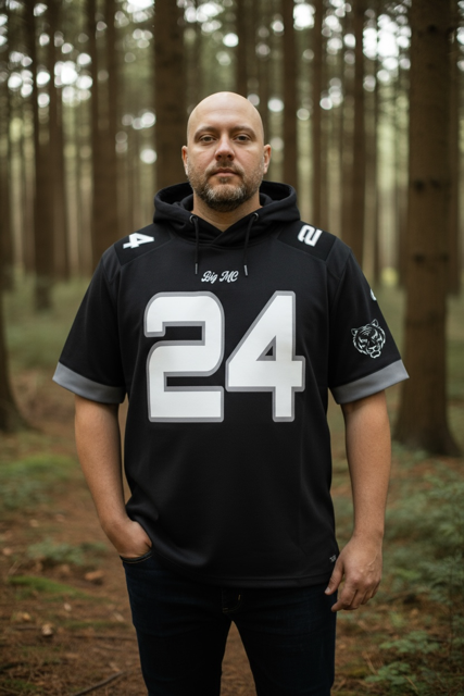 A cool American football sweater short sleeve in black with various prints (badges) on the front, back and sleeves. A limited edition version of the label BigMC.