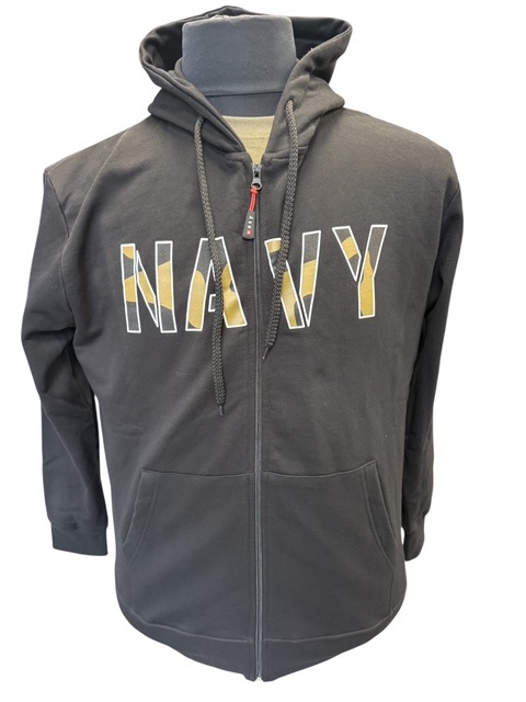 FULL-ZIP HOODIE ADJUSTABLE HOOD WITH DRAWSTRING LONG SLEEVES 2 PATCH-ON SIDE POCKETS RIBBED CUFFS AND BOTTOM “NAVY” CAMOUFLAGE EFFECT PRINT ON CHEST.