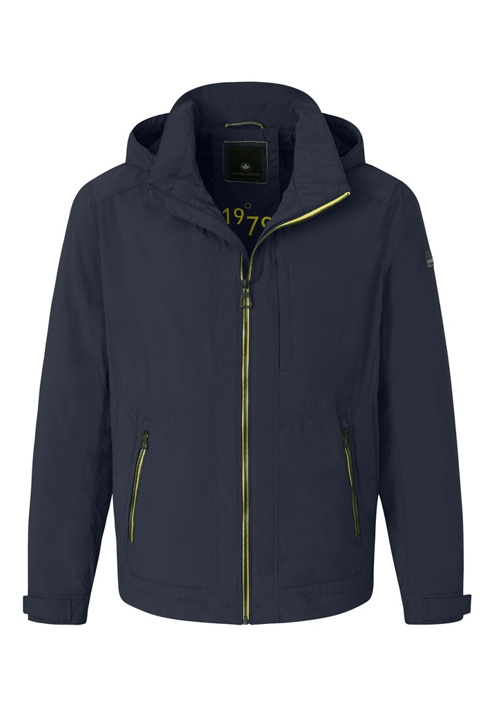 A modern sporty summer jacket in navy from the Redpoint brand, the jacket has various slit and zip pockets (also inside pockets) and has a detachable hood.