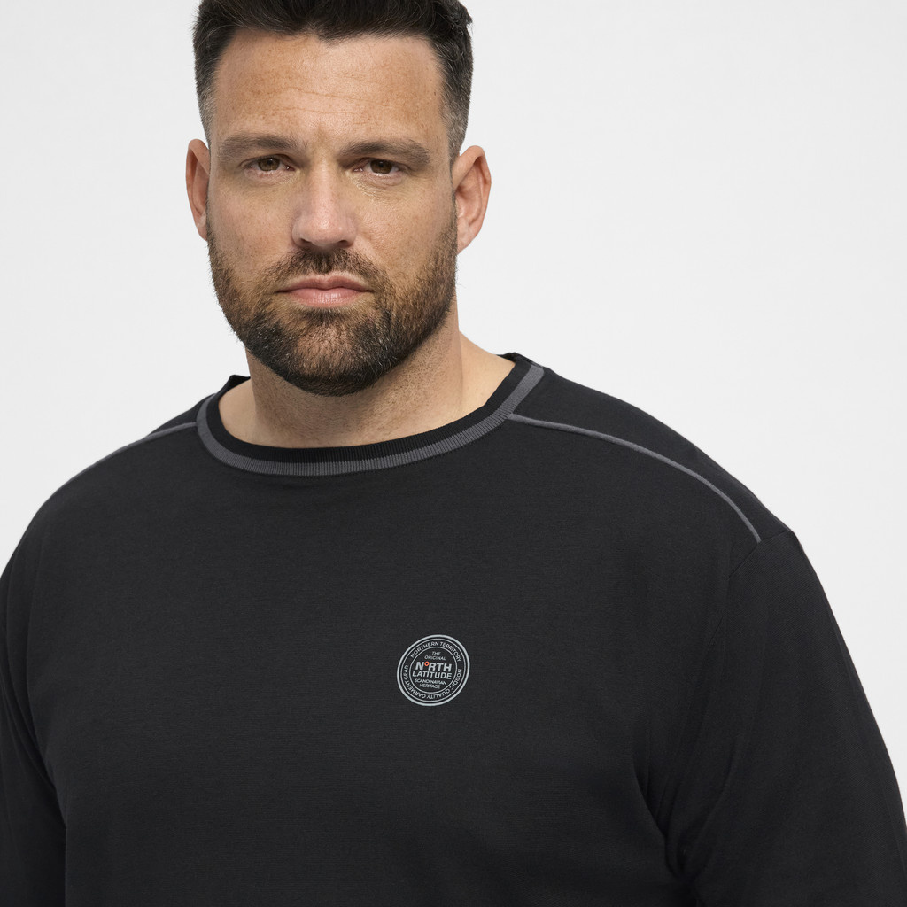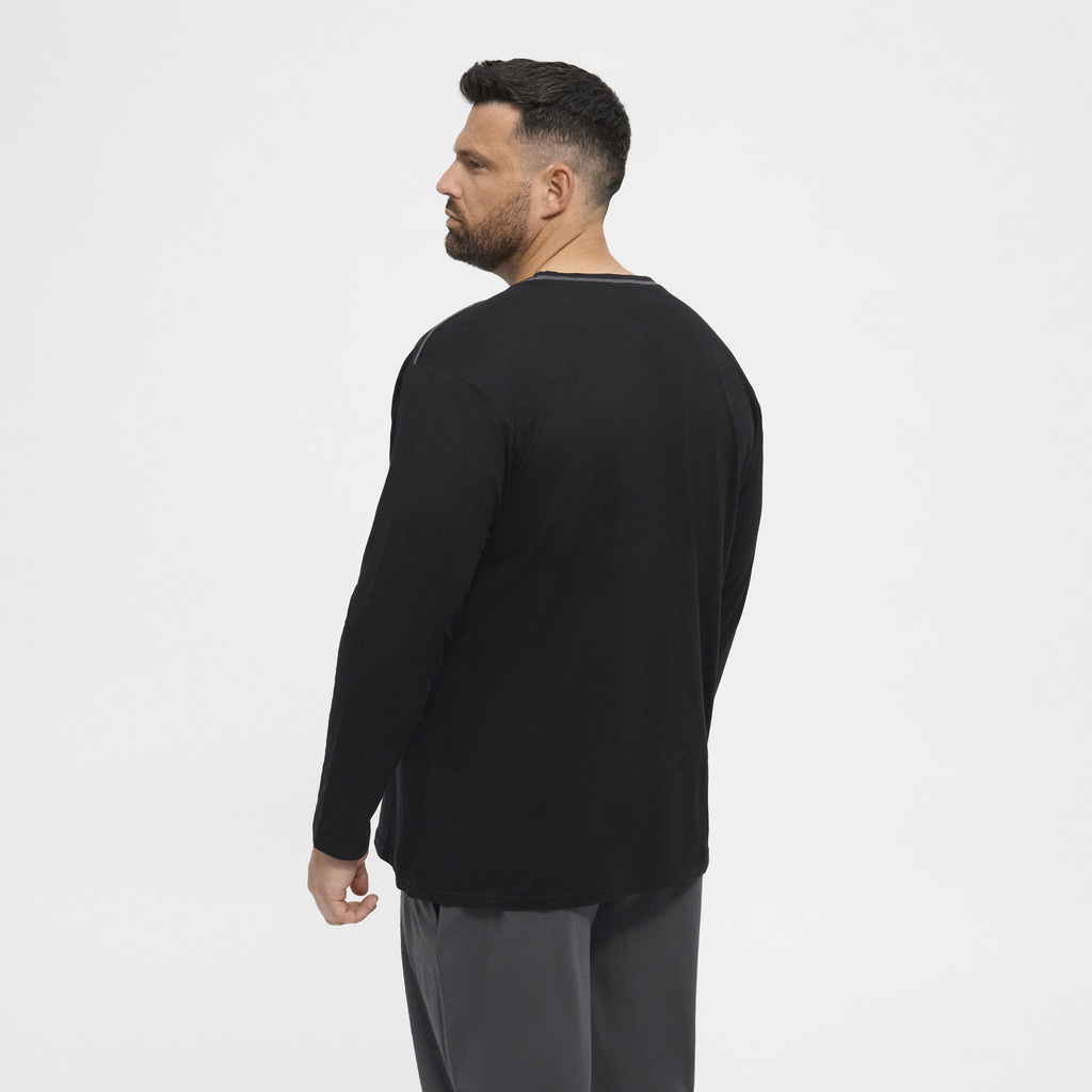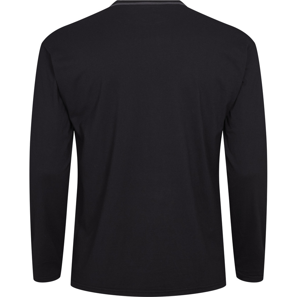A pyjama shirt long sleeve in the colour black. The neck has a grey collar. Shirt has an emblem on the front.
