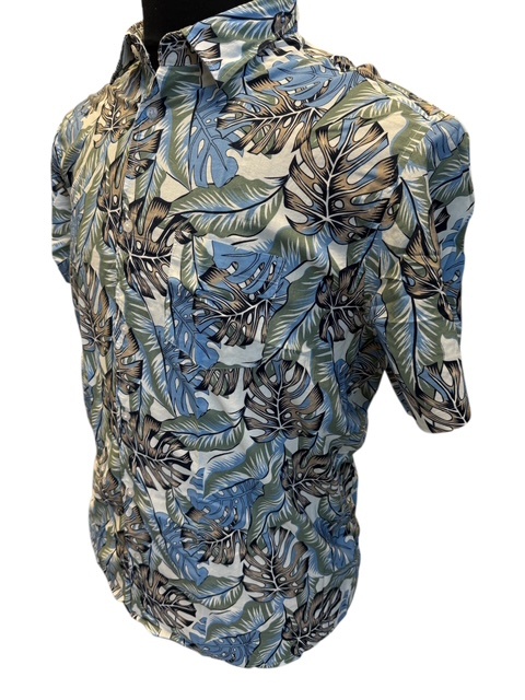A tropical short-sleeved shirt in iron blue from the Pre End brand, the shirt has a breast pocket.