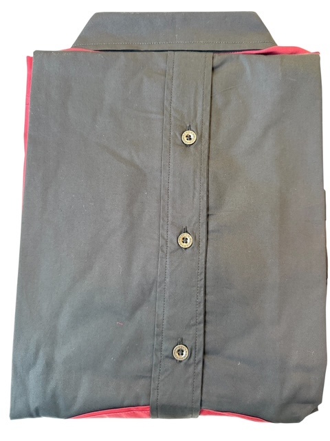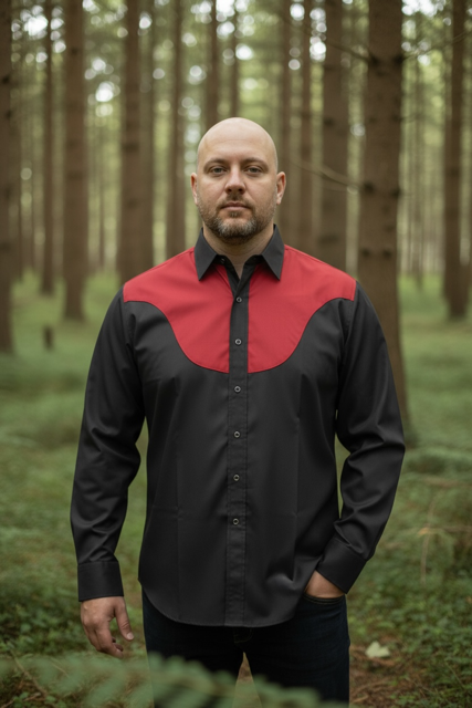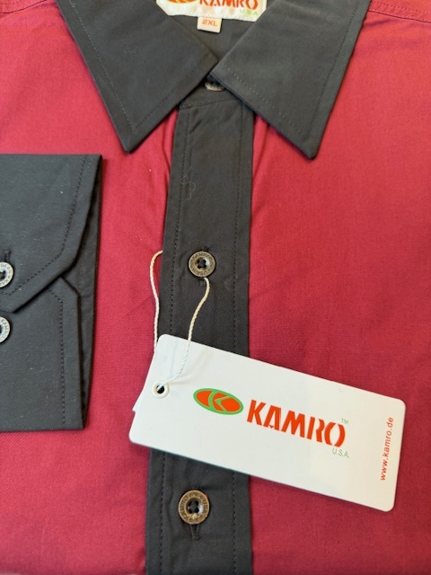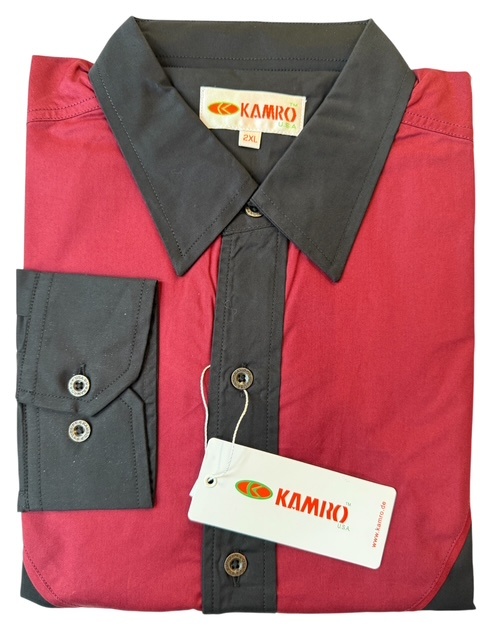 A modern long-sleeved western shirt from Kamro in red/black, with metal buttons.