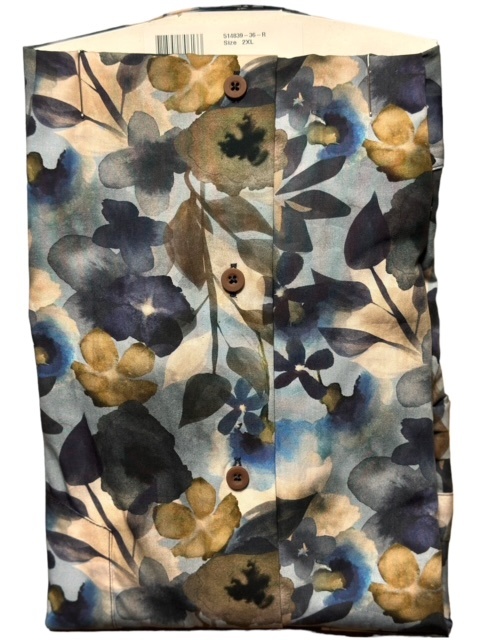 A modern long-sleeved shirt from the Eden Valley brand, the shirt has a beautiful tropical plant print in blue/bronze and also has a breast pocket.