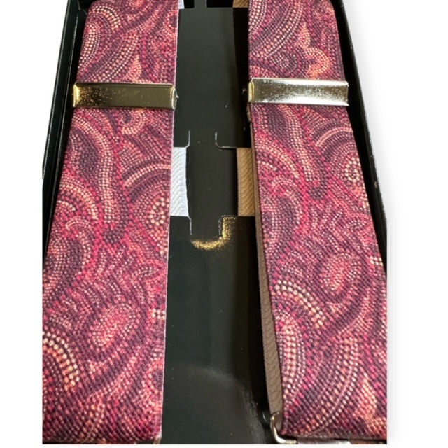 A pair of braces in red, with a retro look. Braces are equipped with wide sturdy clips, so that your clothing stays in the right place.