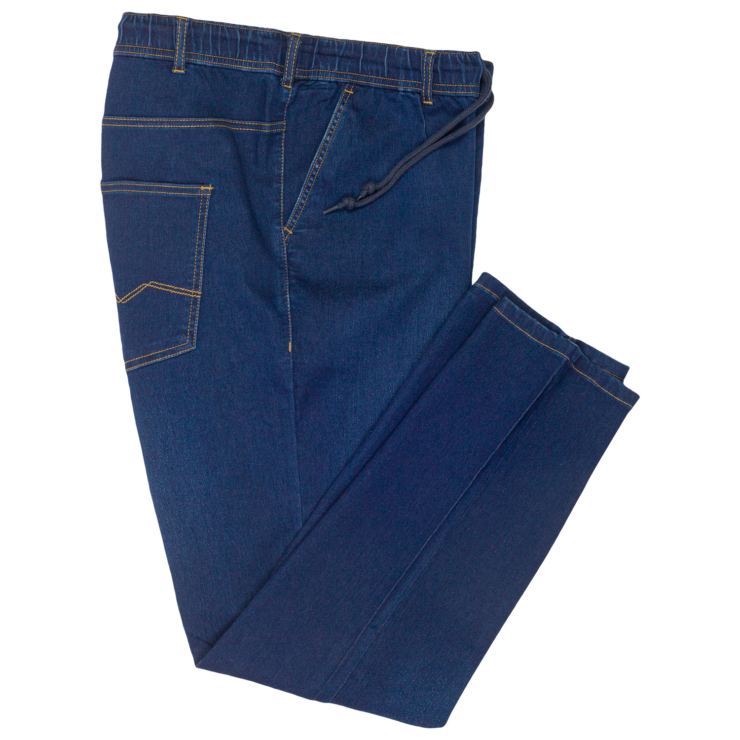 A nice jogging pants that looks like jeans. Pants are provided with an elastic band with drawstring and loops to possibly place a belt in. Color is navy blue.