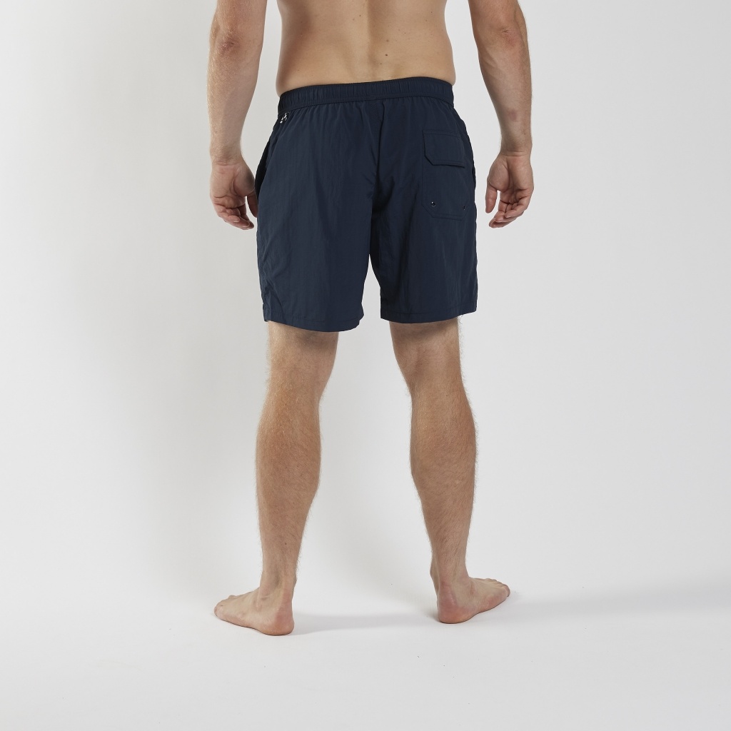Navy blue swim shorts from North Latitude. They have an elastic waistband and drawstring. They also have pockets.