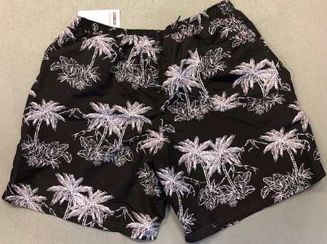 Swim shorts by Kamro. The swim shorts have inner shorts. Two pockets, a left pocket with zip and a back pocket. Material: 100% polyester. Colour: black with white palms.