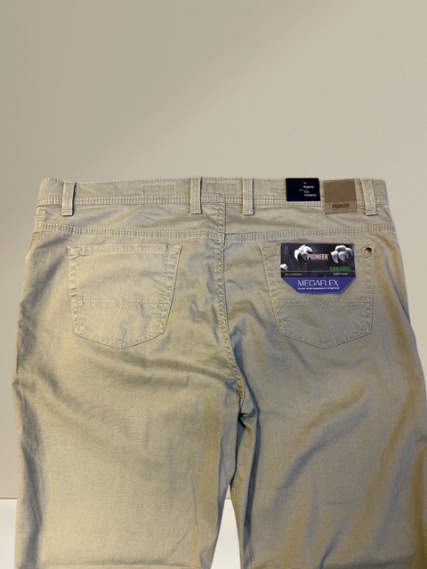 A pair of trousers in the colour light green from the brand Pioneer. Trousers are provided with 2 slit pockets and 2 back pockets. Trousers are provided with megaflex.