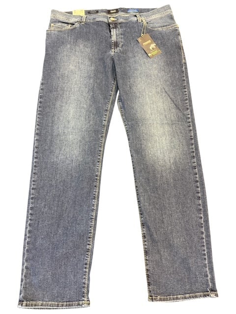 A pair of jeans pants in the style light stone wash by the brand Pioneer. Pants are equipped with 2 slit pockets and 2 back pockets. Pants are equipped with megaflex.