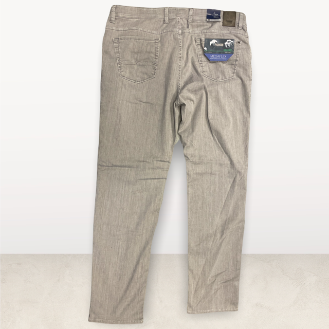 A summer megaflex pants from the brand Pioneer in the color light gray. Pants feel soft and are very comfortable due to the extra stretch that is incorporated in these pants.