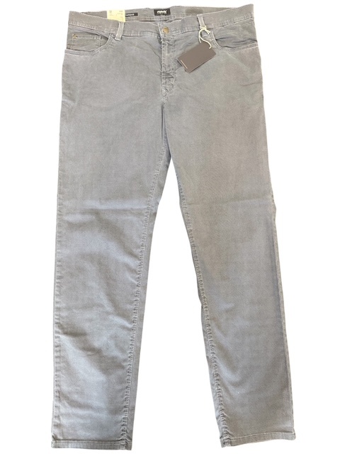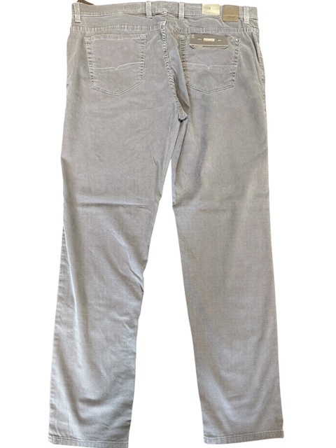 A modern pair of Pioneer trousers in blue/grey. They have a light honeycomb pattern. The trousers are Thomas.