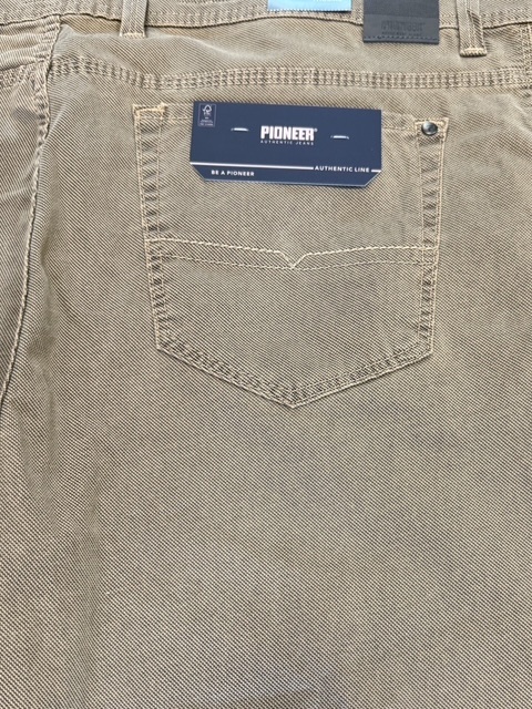 Een moderne broek van het merk Pioneer in de kleur koper/brons. broek heeft een lichte honinggraad motief. Broek is model Thomas.
