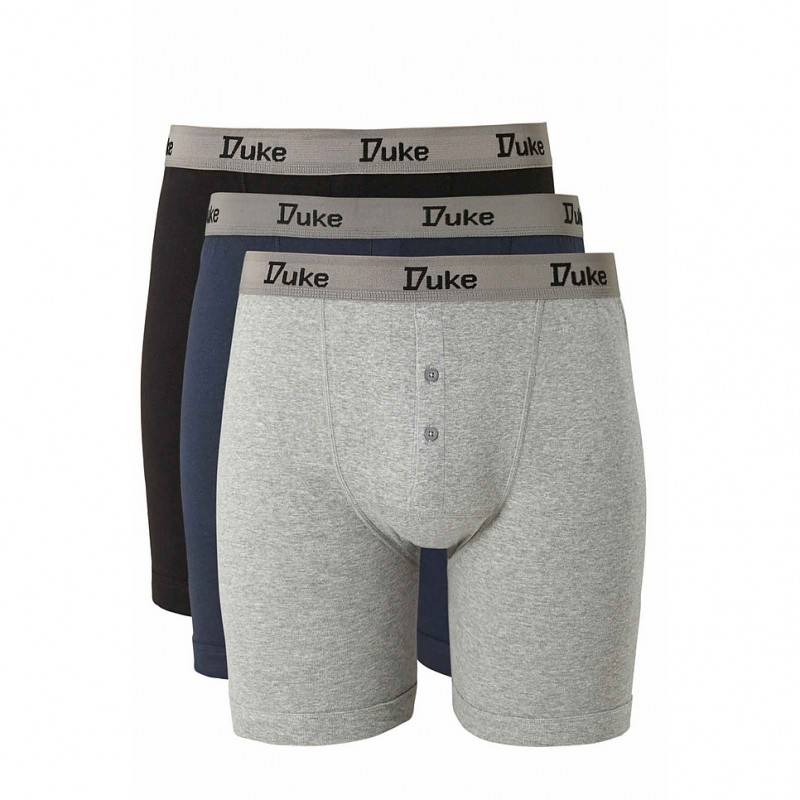 Boxershorts van het merk Duke, in 3 verschillende kleuren: grijs, blauw en zwart.