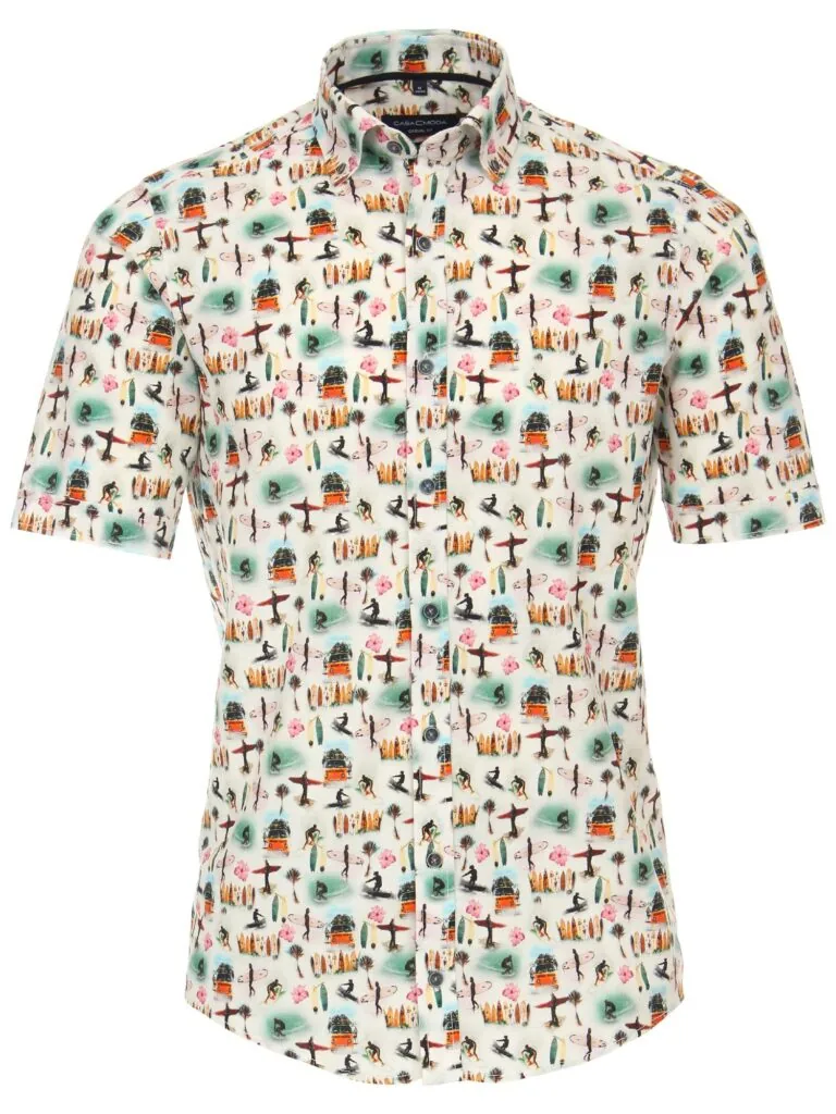 Een zomers overhemd korte mouw met een tropische opdruk, hemd is voorzien van een borstzakje.