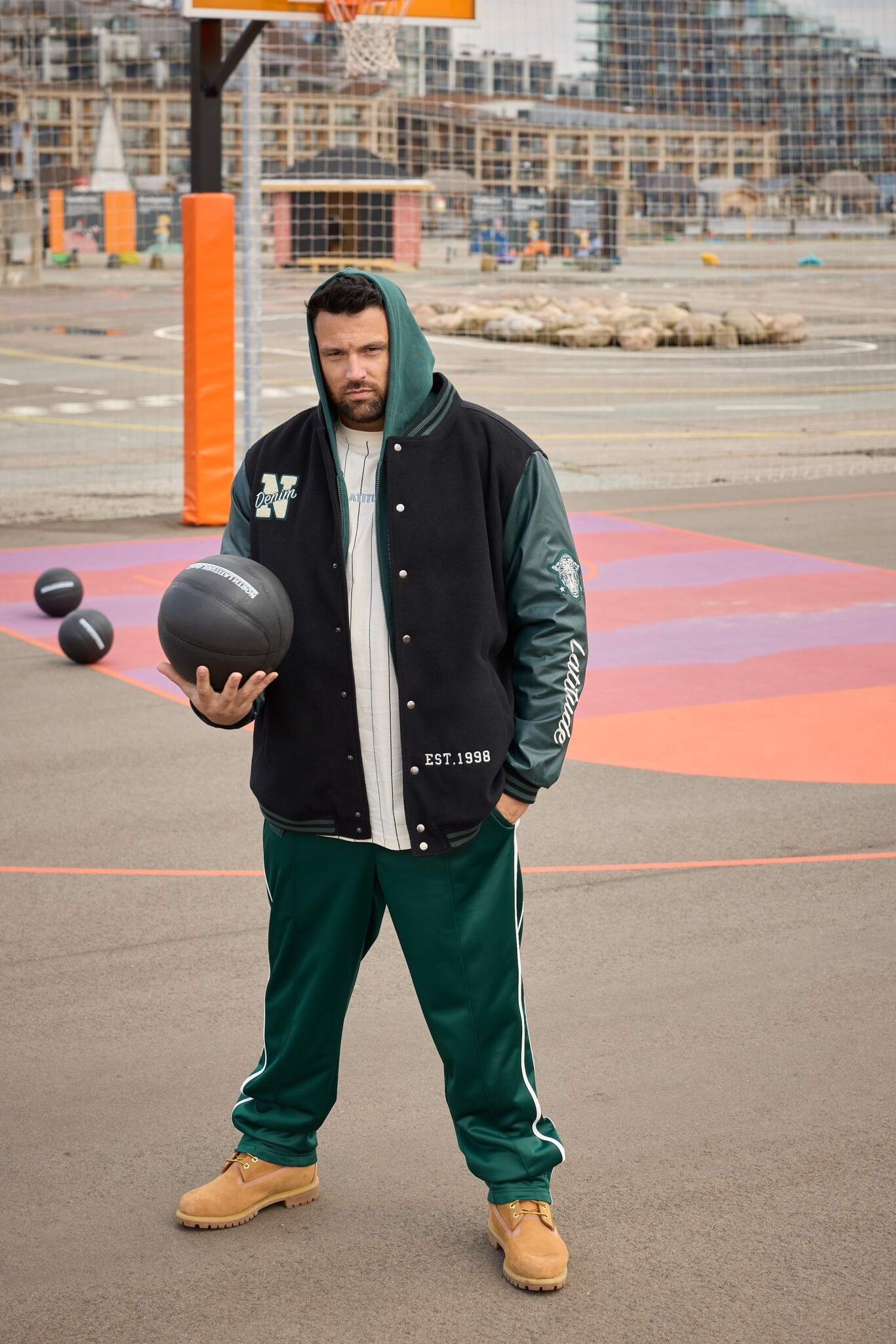Klassiek collegejack met wollook en mouwen van imitatieleer. Comfortabel, gevoerd en gedetailleerd met borduursels en applicaties.
